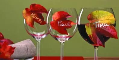 将树叶或鲜花使用双面胶带粘贴在酒杯上,别具一格